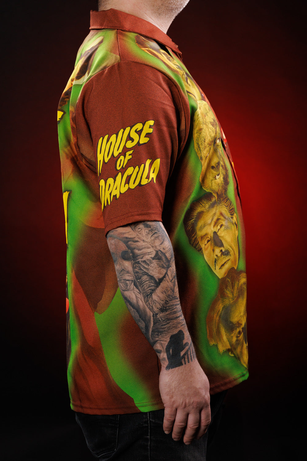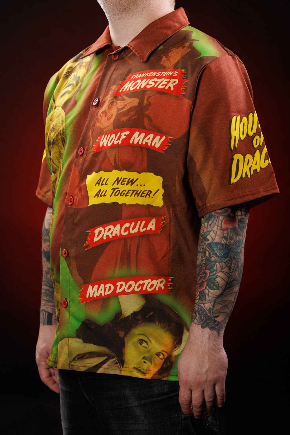 A monstrous twist on the classic Aloha shirt, this all-over print button-up uses art from the 1945 House of Dracula to bring some undead swagger to your wardrobe. It’s stylish, spooky, and guaranteed to start conversations—especially with people who appreciate horror… or questionable vacation choices.
